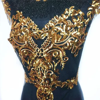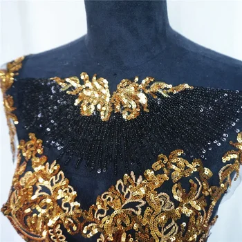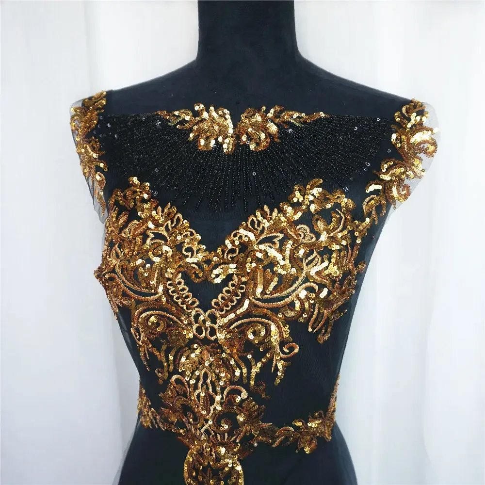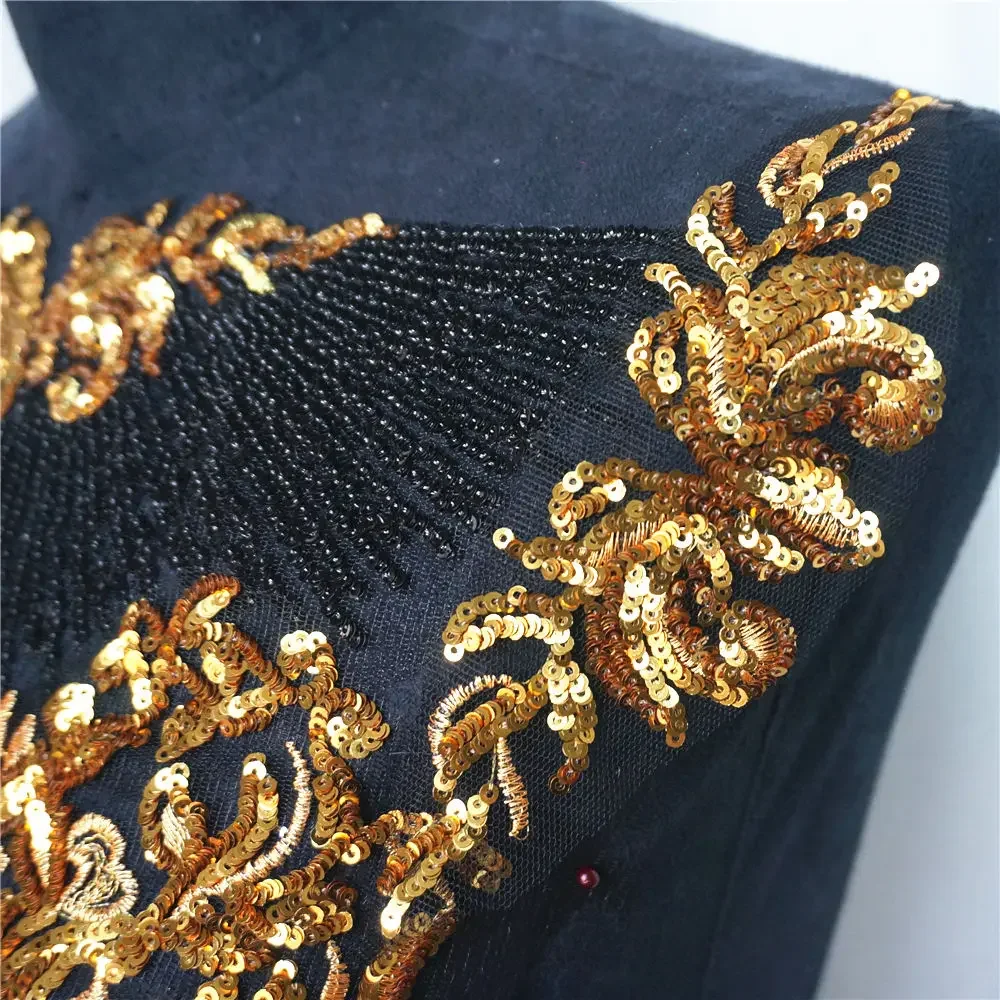 Transform your creations with the exquisite 1 Set Black Tulle Gold Sequin Embroidery Lace Fabric Tassel. Perfect for adding a touch of elegance to wedding gowns and bridal dresses.
