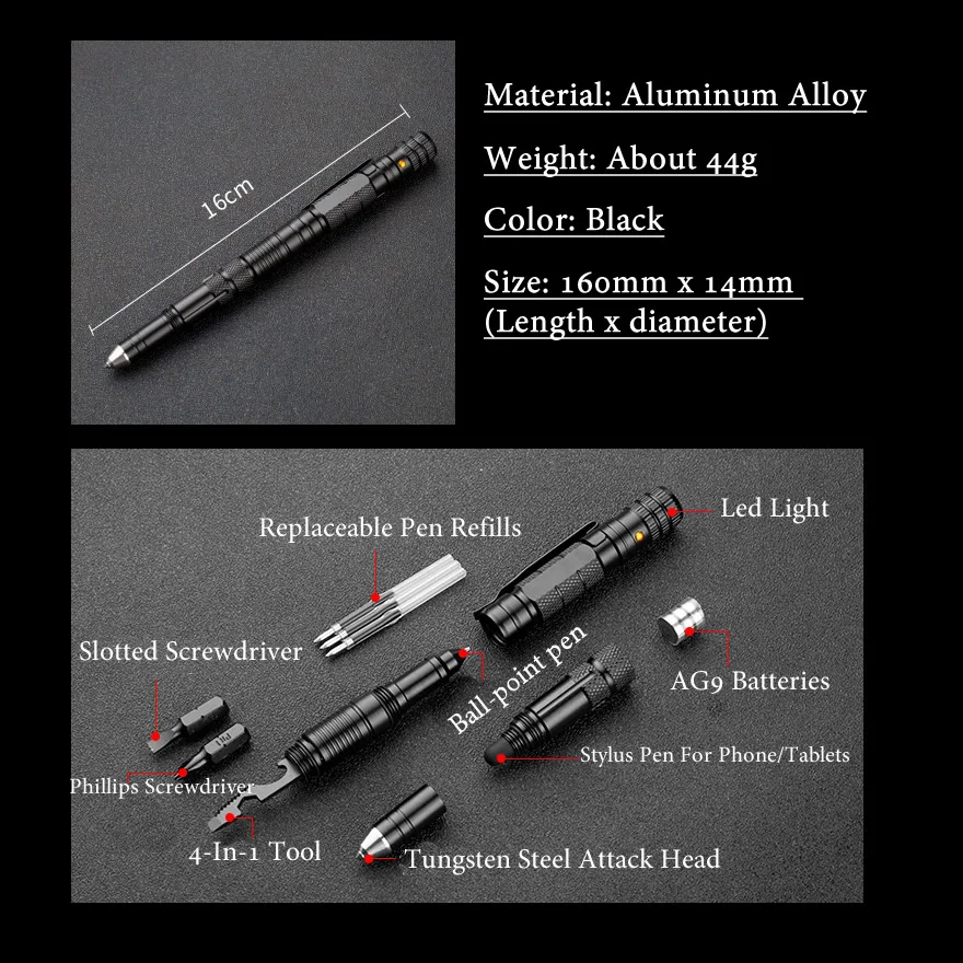 Discover the ultimate tool for every adventure with our 10-In-1 Multi Function Tactical Pen. Perfect for self-defense and outdoor survival, this versatile EDC tool combines practicality with innovation.
