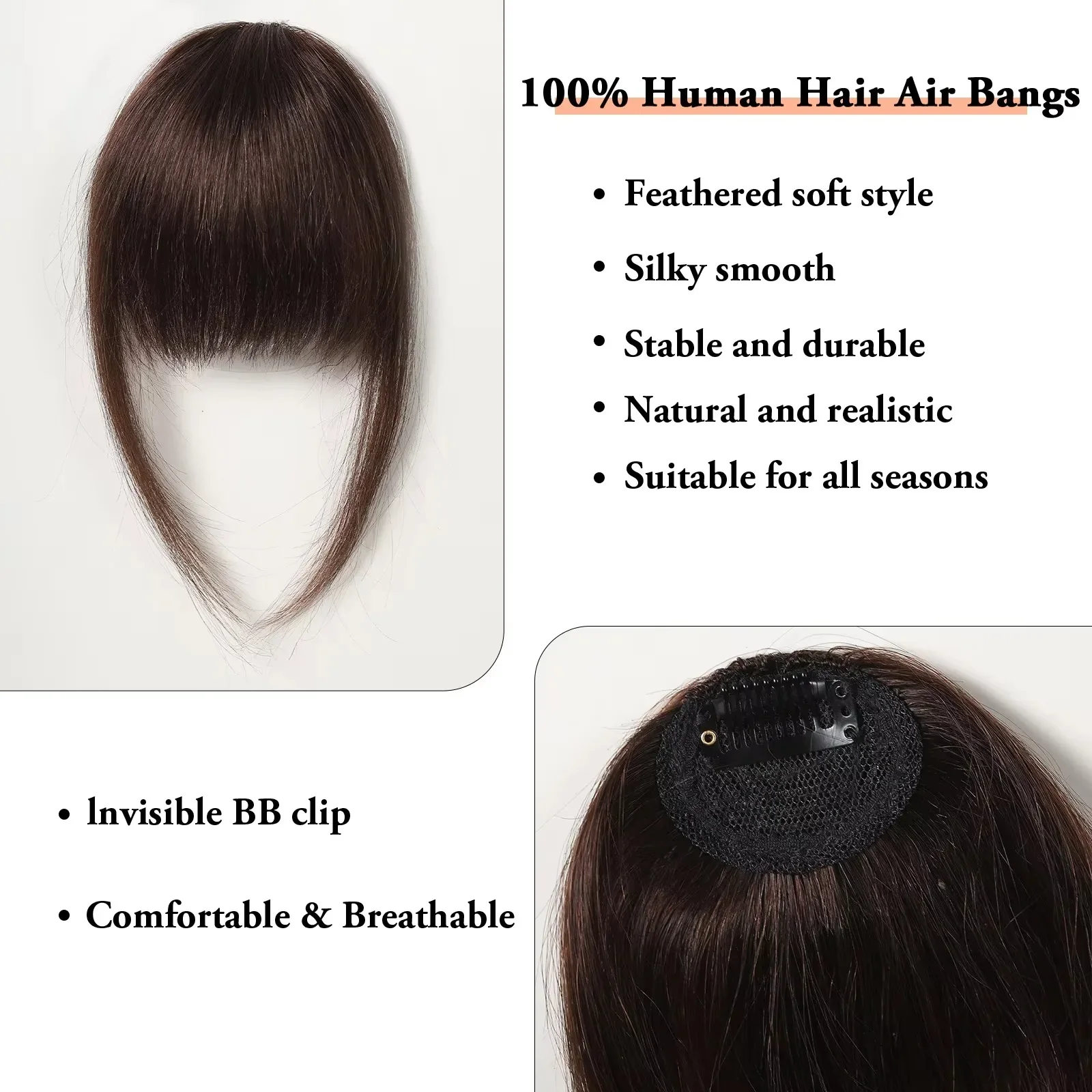 Transform your look effortlessly with the 100% Human Hair Bangs in Natural Brown. This wispy clip-in fringe is perfect for adding volume and style to your hair instantly.