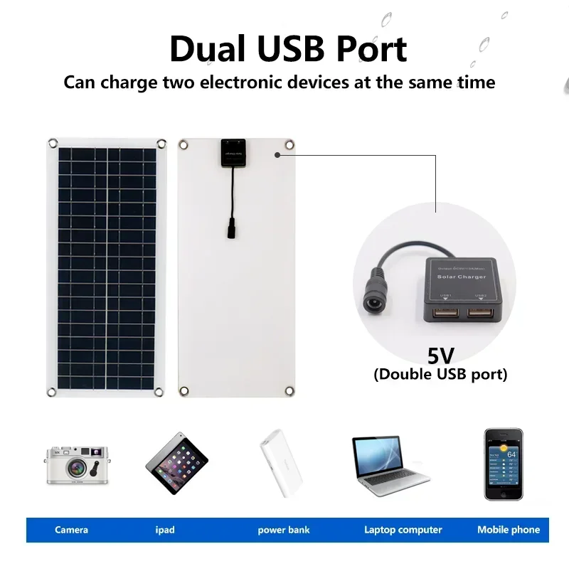 Experience energy independence while camping, hiking, or traveling. This solar panel kit includes everything you need: a solar controller, car charger, suction cups, and alligator clip wire for easy setup.