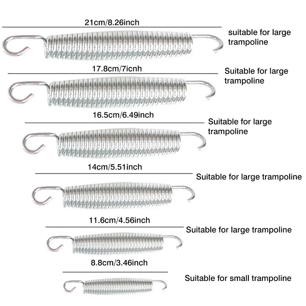 These springs are perfect for trampolines ranging from 4.57 to 8.27 feet. With a slightly curved shape, they offer superior tensile strength compared to traditional straight springs. Enjoy endless jumping joy with peace of mind knowing your springs are built to last!