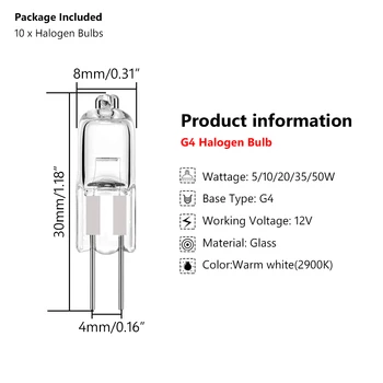 Illuminate your space with the 10 pcs G4 Halogen Bulb set. Offering a warm white glow, these energy-efficient bulbs are perfect for various lighting needs, from chandeliers to under-cabinet fixtures.