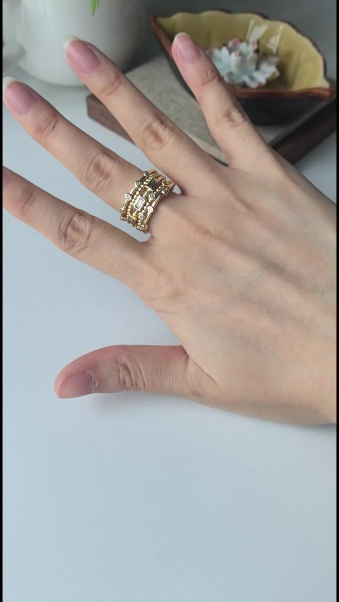 Care for your ring by gently wiping it with a soft cloth to maintain its shine. Wear it solo or stack it with other rings for a chic look. Embrace this trendy accessory and make a statement wherever you go!