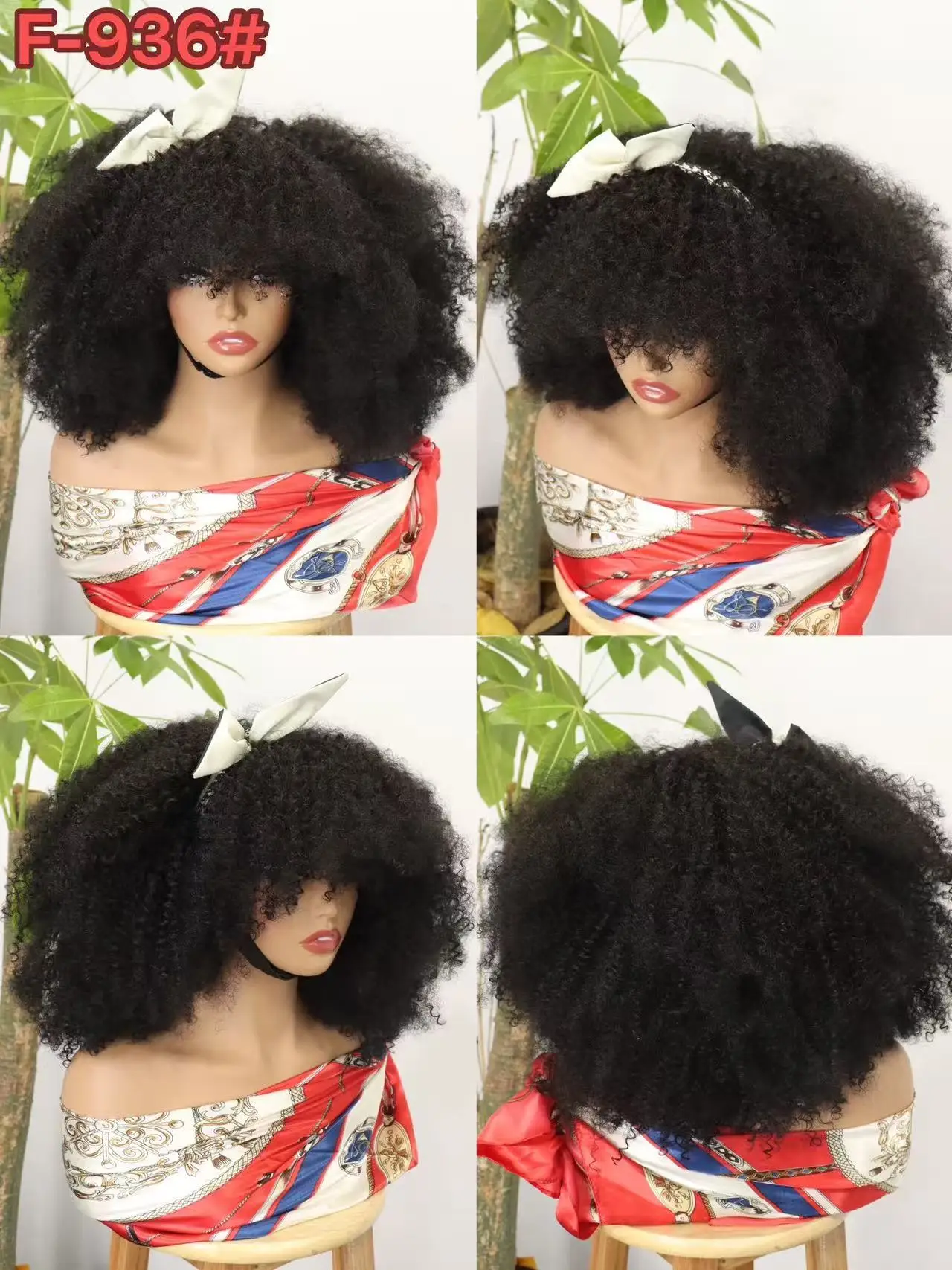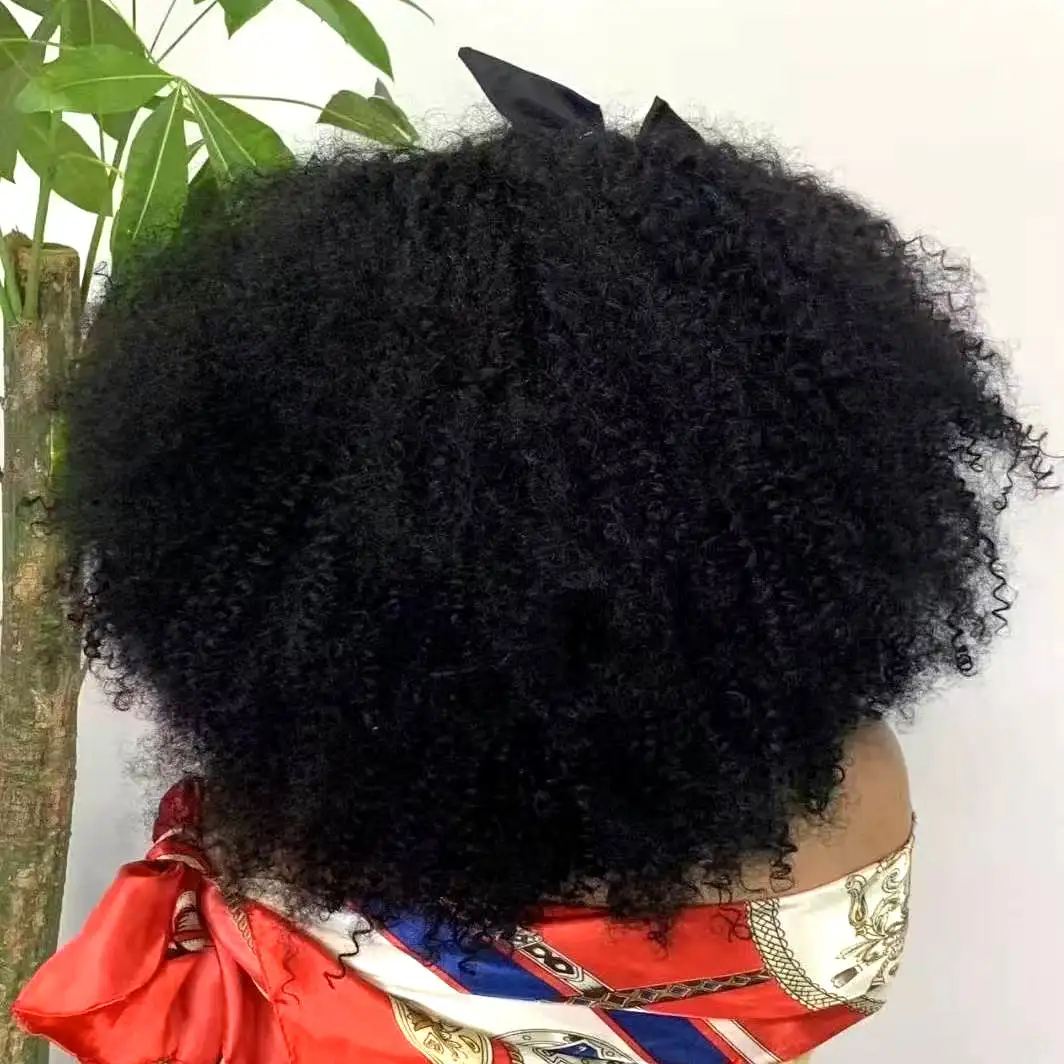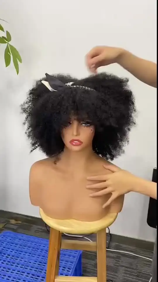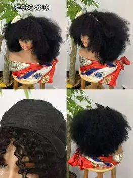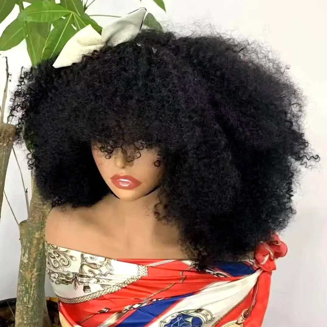 Elevate your style with the 350% Density Natural Afro Kinky Curly Human Hair Wig with Bangs. This stunning 14-inch full machine-made wig offers a natural look and feel, perfect for any occasion.