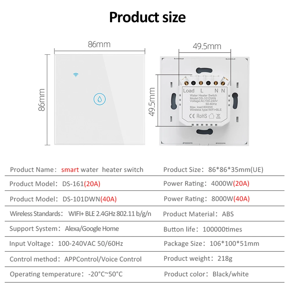 Experience ultimate convenience with the 40 A Tuya Smart Wi-Fi Water Heater Boiler Touch Wall Switch. Perfect for controlling high-power devices like water heaters and air conditioners, this smart switch integrates seamlessly into your home.