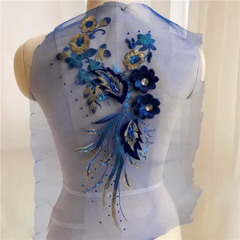 Elevate your designs with our exquisite Blue Frence Fabric Lace Trimmings featuring stunning sequins patches. Perfect for prom dresses, wedding gowns, and DIY projects, this lace adds an elegant touch to any outfit.
