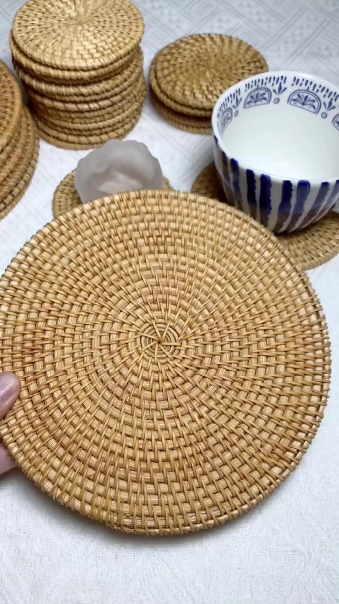 Elevate your dining experience with our Round Natural Rattan Hot Pads. Hand-woven for a unique touch, these coasters blend practicality with style, ensuring your table remains pristine during every meal.
