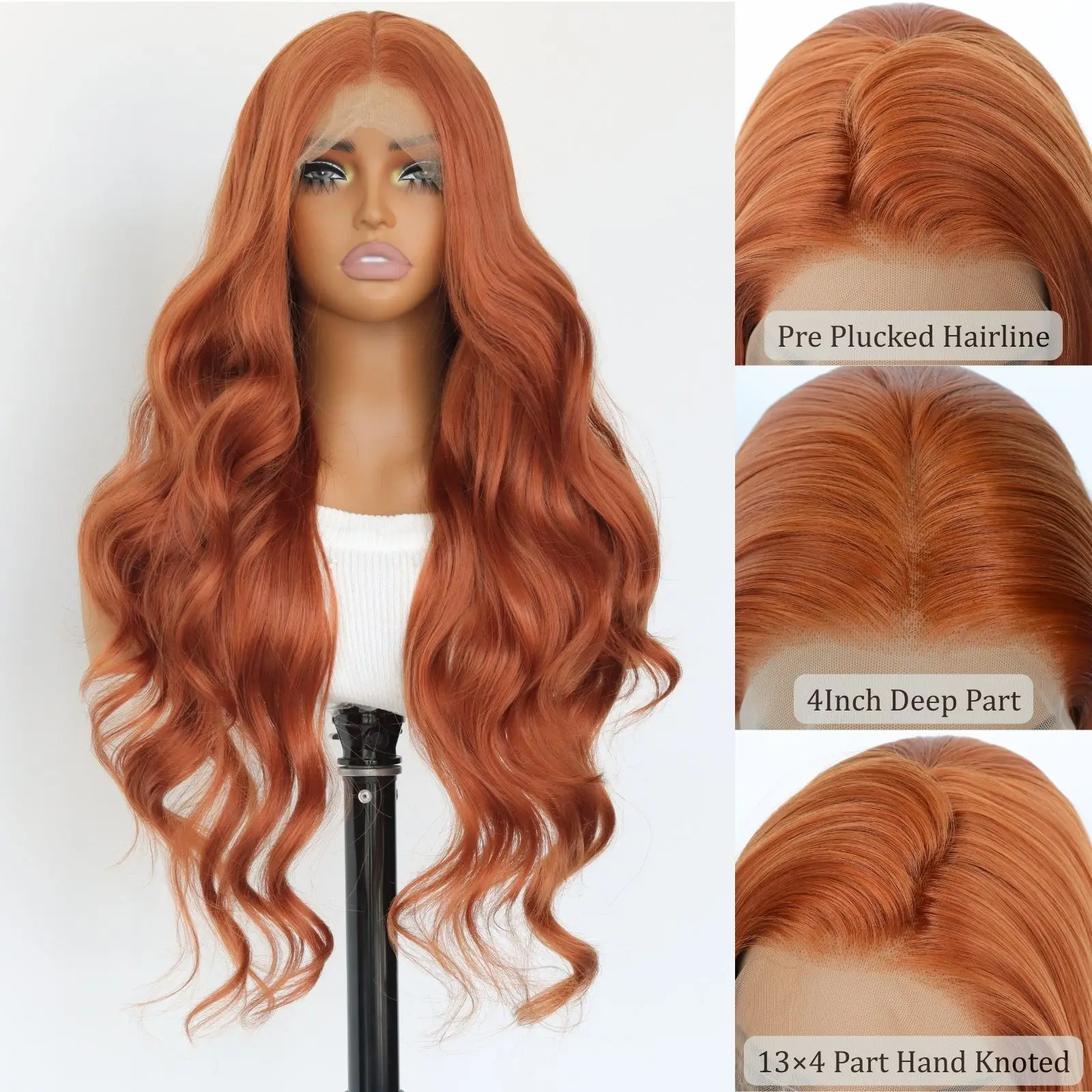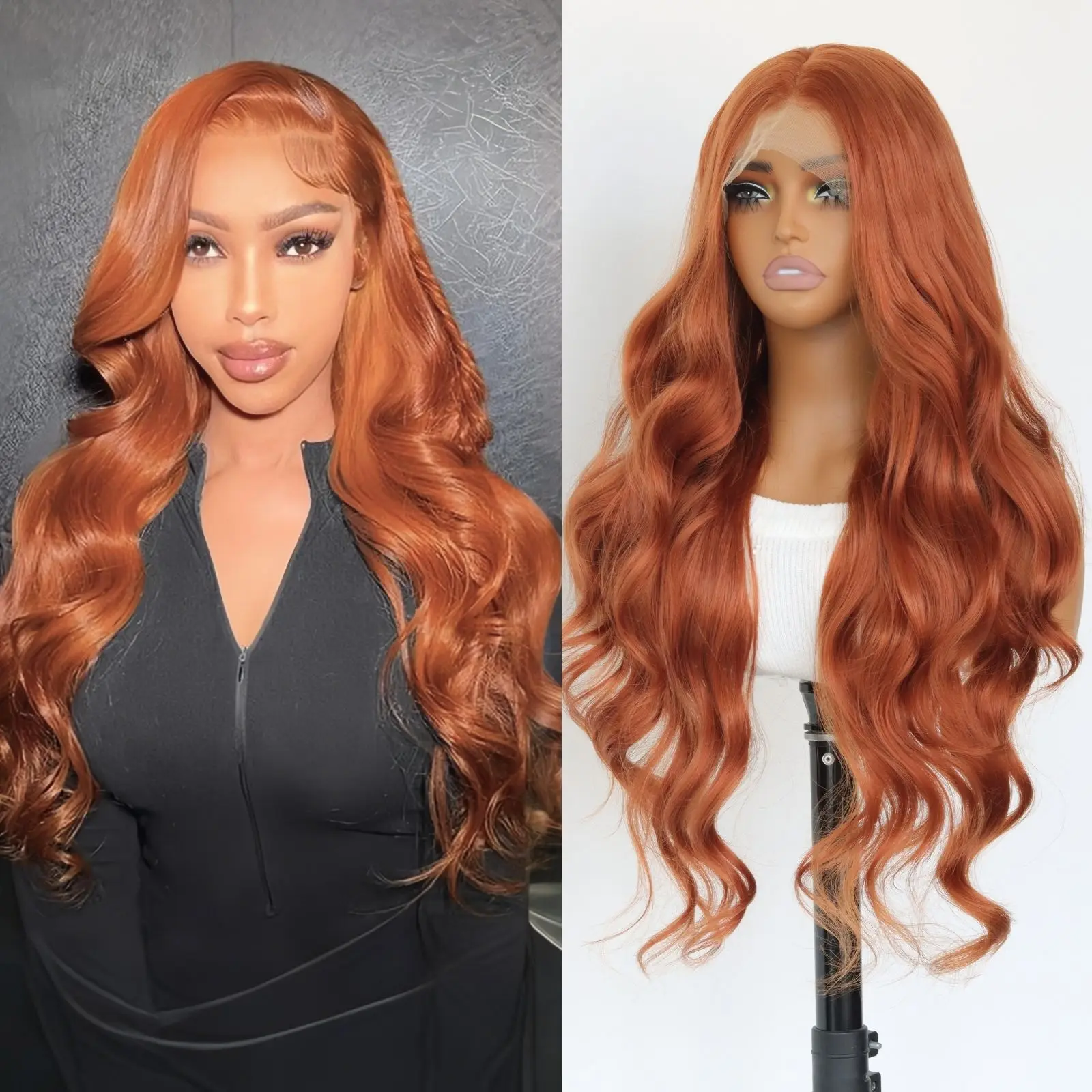 Elevate your look with the Ginger Orange 13 X4 Lace Front Synthetic Wig, designed to bring vibrancy and elegance to your style. Perfect for daily use, this stunning 24-inch long body wave wig is crafted for those who want to stand out.