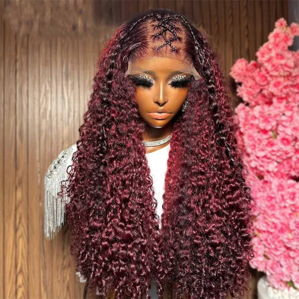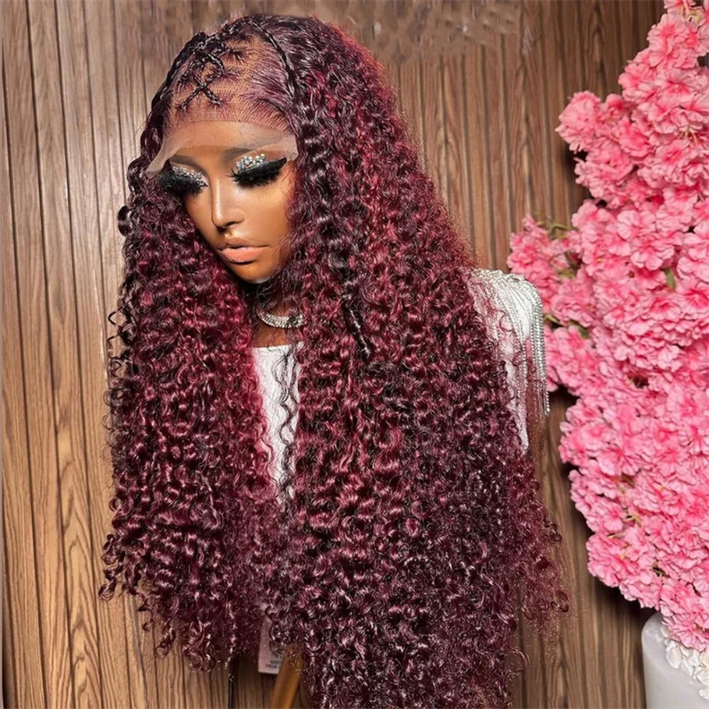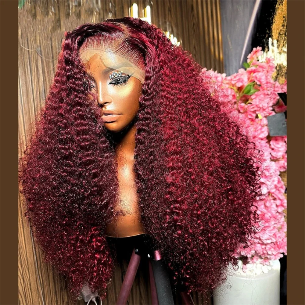 Transform your look effortlessly with our Long 26 Inch 180 Density Soft Burgundy Kinky Curly Preplucked Glueless Synthetic Lace Front Wig. Perfect for daily use, this stylish wig offers versatility and comfort.