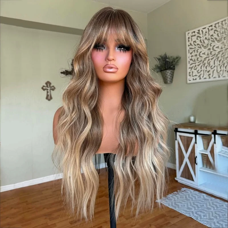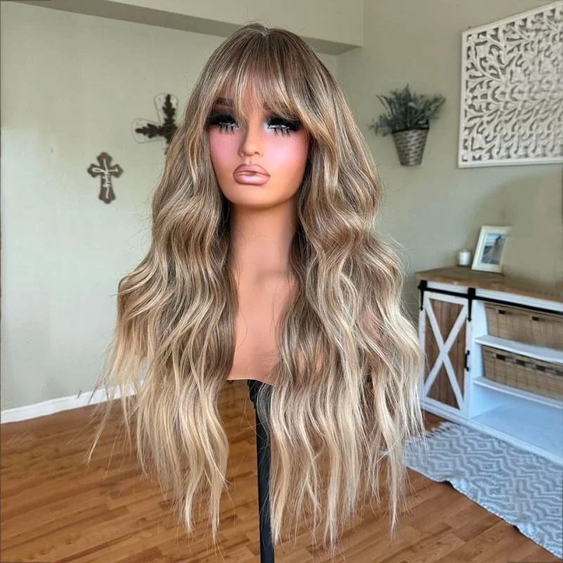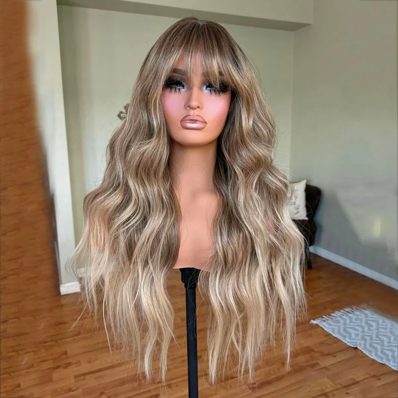 Elevate your look with the Lothoey 613 Transparent Lace Full Lace Wig. Crafted from 100% unprocessed human hair, this luxurious wig features a stunning ombre light brown ash blonde color, complete with bangs for a modern touch.