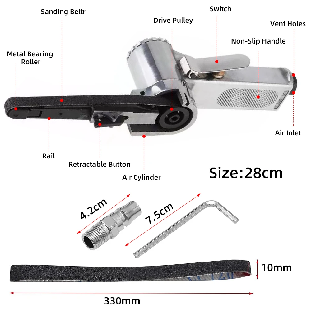 Package includes: 1 x Air Belt Sander, 10 x Sanding Belts, 1 x Pneumatic Interface, 1 x Small Inner Hex Wrench.