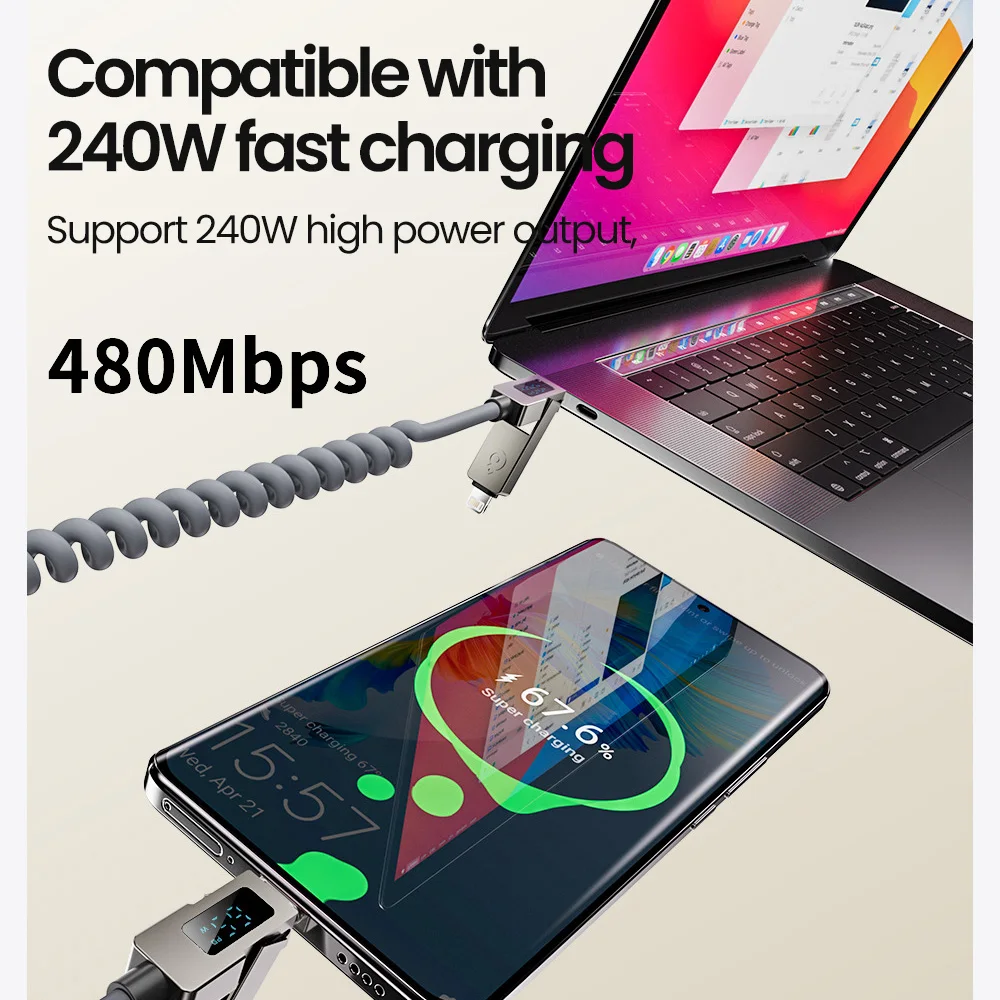 Introducing the PD 240 W 4 in 1 USB Type C to Type C Fast Charging Cable, your ultimate charging solution for modern devices. Designed for efficiency, this spring retractable data cable combines versatility and speed for your iPhone 15/16 and Samsung devices.