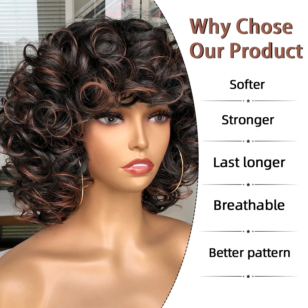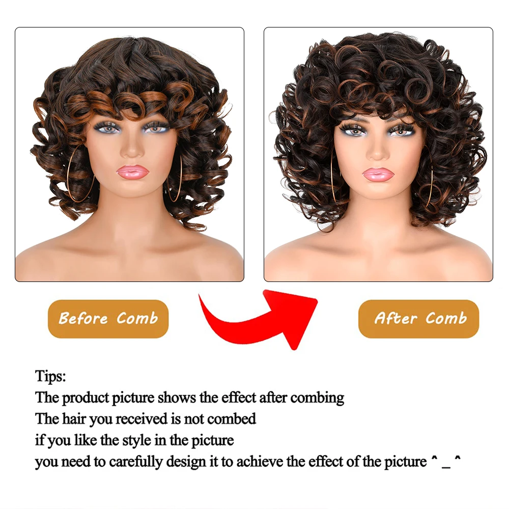 Elevate your style with the Short Hair Deep Curly Wigs with Bangs, designed specifically for Black women. This fluffy synthetic wig offers a beautiful ombre blend of brown and blonde, perfect for any occasion.