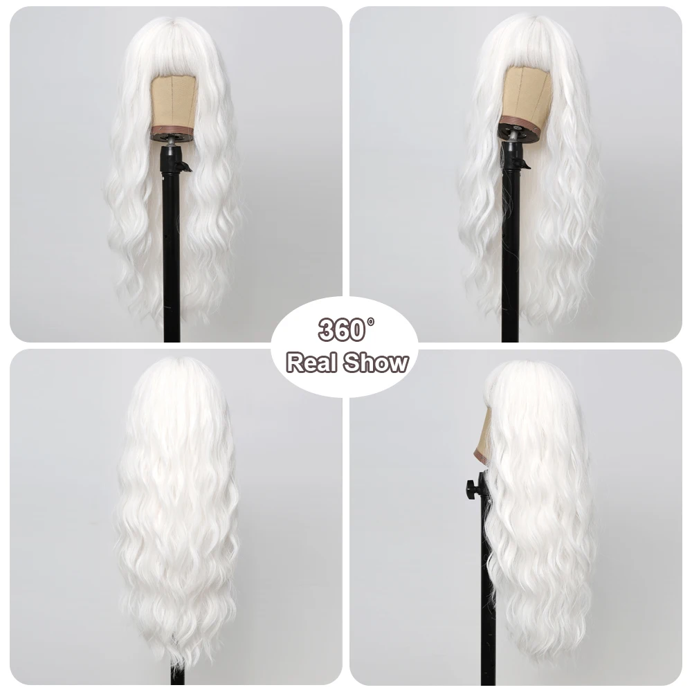 Transform your look effortlessly with our White Curly Wig! This stunning long wavy synthetic hair wig with bangs is perfect for any occasion, from cosplay to holiday parties.