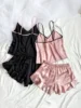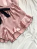 Indulge in ultimate comfort with our Women's Smooth Satin Pajamas. This stylish set features a chic V-neck t-shirt and charming ruffled edge shorts, perfect for lounging or a good night's sleep.